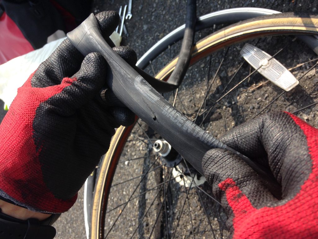 運悪く何か鋭利なものでも踏んだんだろうと思って替えのチューブを交換して進もうとしたら、タイヤのサイドからチューブがはみ出している。どうやらタイヤの劣化でタイヤサイドが破断し、そこからチューブがはみ出してパンクしたらしい。この状態だとタイヤ自体を交換しないと、またすぐにパンクしてしまう。